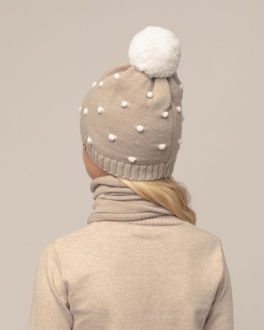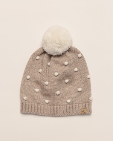 Children's hat made of natural merino wool - soft, elastic and practical for everyday wear. Natural wool helps maintain an even body temperature and effectively evaporates moisture - so the child's head remains dry and pleasantly warm. The single-layer knit, which adapts to the head, does not restrict movement and ensures comfort for active leisure. Perfect for the transitional season. Small knitted dots give the hat a playfulness, and the pompom at the top is a cute accent for everyday style.