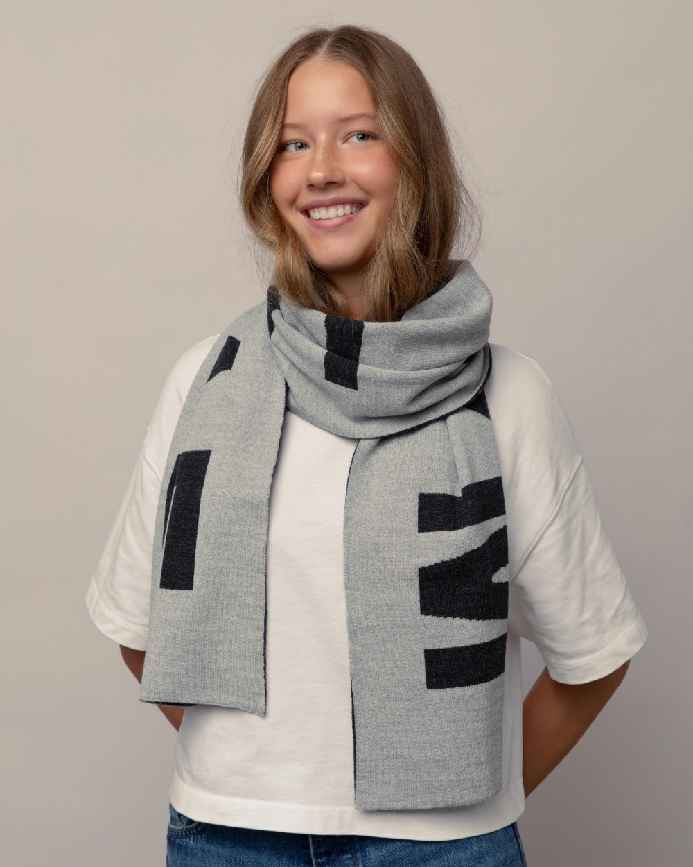 Merino wool double knit scarves are knitted in Lithuania. On the scarf you will find the inscription "MYLIU TAVE" which disappears when the scarf is tied and looks like a delicate knitted pattern. Merino wool is an extremely soft wool that pleases even customers with sensitive skin.