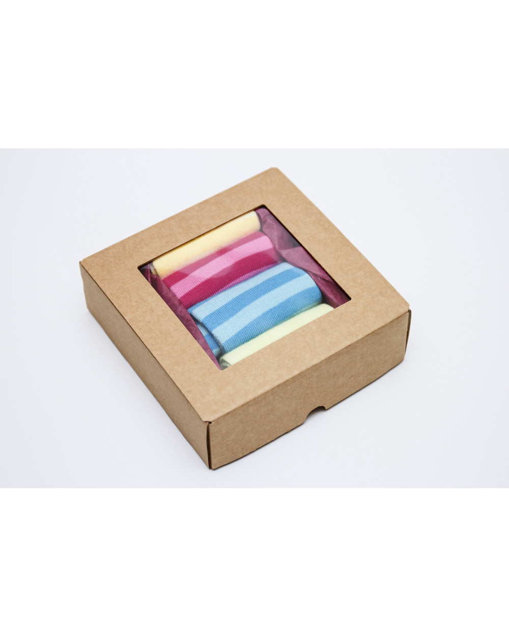 The box contains 4 pairs of heel-less toe socks in various randomly selected colors.