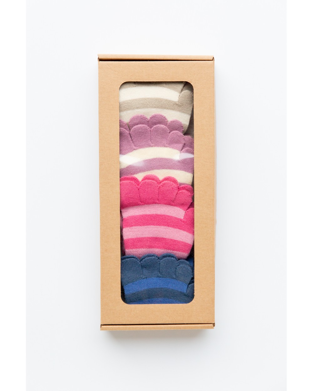 Each pack includes 4 pairs of heelless toe socks in assorted colors.