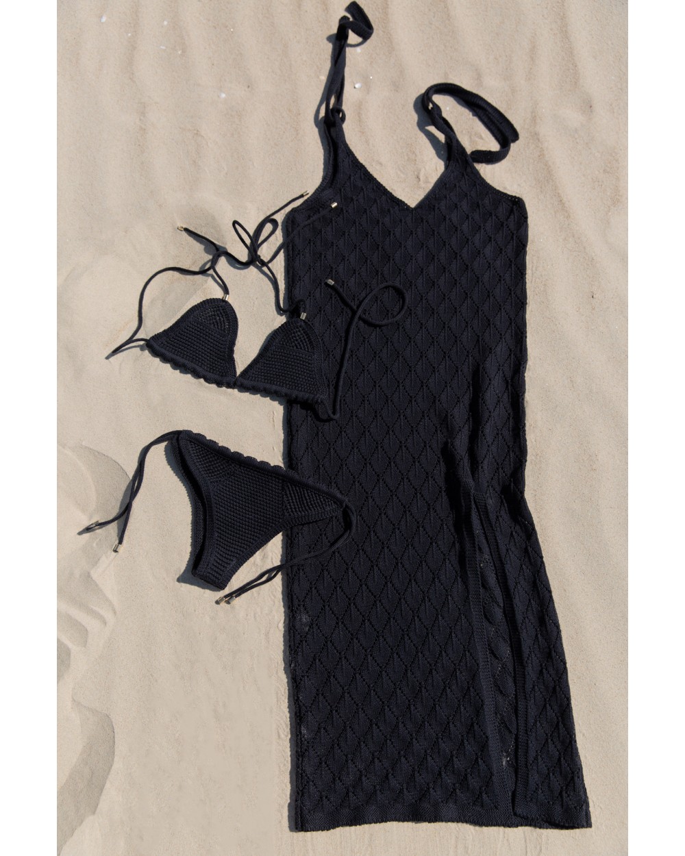 Kleidi külgedel olevad lõiked pakuvad liikumisvabadust ja naiselikku välimust. Kui vaatate kudumismustrit lähemalt - väikesed lehed asuvad teie kehal, võimaldades nahal hingata ja individuaalselt kohaneda iga naise keha kujuga.